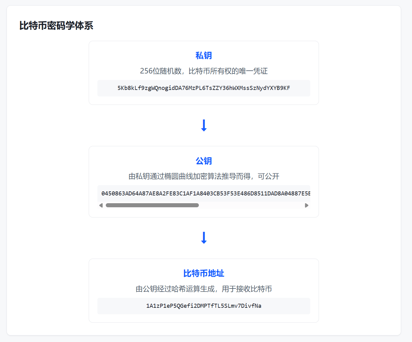 私钥生成机制:私钥是一个 256 位的随机数,是比特币所有权的唯一凭证。拥有私钥就等于拥有了对应地址上比特币的绝对控制权。私钥必须严格保密,一旦丢失,其对应的比特币将永久无法找回。