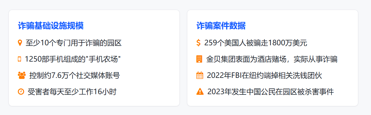 某国司法部指出,太子集团旗下的金贝集团表面上是豪华酒店和赌场,实际上干的全是敲诈勒索、诈骗。2023 年,还有个 25 岁的中国小伙在这儿被残忍杀害。2022 年,某国联邦调查局在纽约端掉一个洗钱团伙,发现有 259 个某国人被金贝集团骗走了 1800 万美元。
