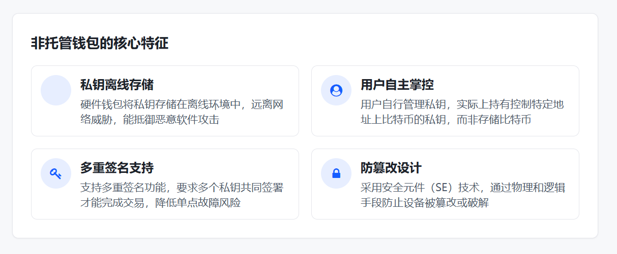 用户自主掌控:非托管钱包要求使用者自行管理私钥,用户实际上并不 存储 比特币,而是持有控制特定地址上比特币的私钥。区块链上只记录着每个地址的余额和所有交易历史。