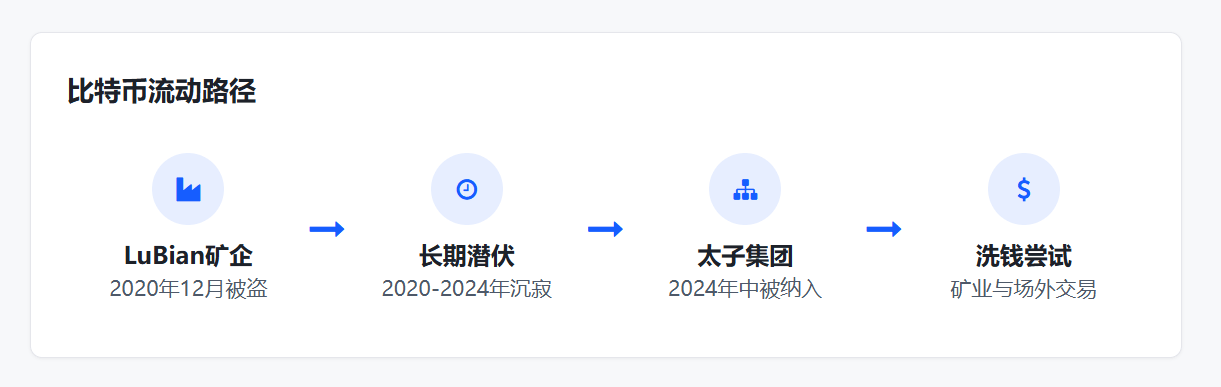 这些比特币长期处于沉寂状态,直到 2024 年中才开始活跃,其移动路径与太子集团控制的钱包集群出现重叠。这意味着,调查揭示的并非简单的 诈骗 - 洗钱 链条,而是一条更复杂的路径:黑客劫掠矿场→长期潜伏→被犯罪组织纳入资金池→试图通过矿业与场外交易洗白。