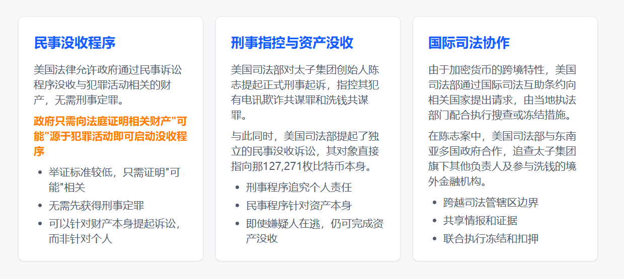 由于加密货币的跨境特性,某国司法部通过国际司法互助条约向相关国家提出请求,由当地执法部门配合执行搜查或冻结措施。在陈志案中,某国司法部与东南亚多国政府合作,追查太子集团旗下其他负责人及参与洗钱的境外金融机构。这种国际合作使执法部门能够跨越司法管辖区边界,全面打击加密货币犯罪网络。
